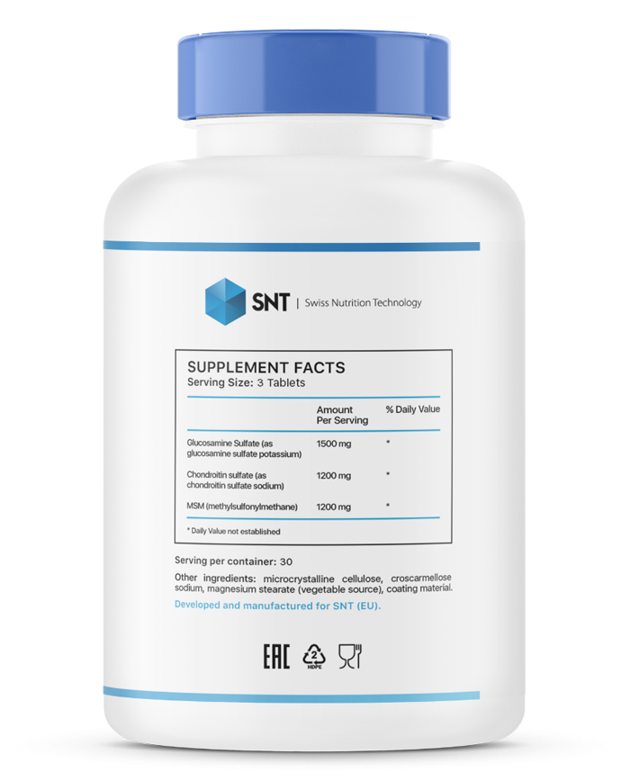 SNT Glucosamine Chondroitin MSM биологически активная добавка к пище, созданная для профилактики и лечения заболеваний опорно-двигательного аппарата. Прием препарата способствует сохранению и восстановлению структурной целостности суставов и соединительных тканей. Снижается риск получения травм на спортивных занятиях, увеличивается подвижность суставов. SNT Glucosamine Chondroitin MSM уменьшает воспалительные процессы, боль в суставах, способствует ускорению восстановления хрящевой ткани после травм.